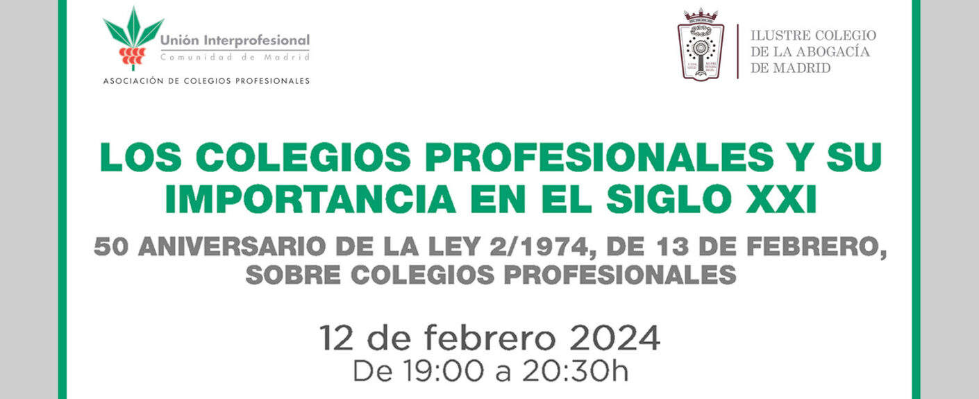 Con motivo del  50 aniversario de la Ley 2/1974, de 13 de febrero, sobre Colegios Profesionales, Unión Interprofesional en colaboración con el Ilustre Colegio de la Abogacía de Madrid, celebrará una jornada sobre Los Colegios Profesionales y su importancia en el siglo XXI, que tendrá lugar el próximo, 12 de febrero, de 19.00 a 20.30h, en el Salón de Actos del Ilustre Colegio de la Abogacía de Madrid (C/ Serrano, 9 – 1ª planta).