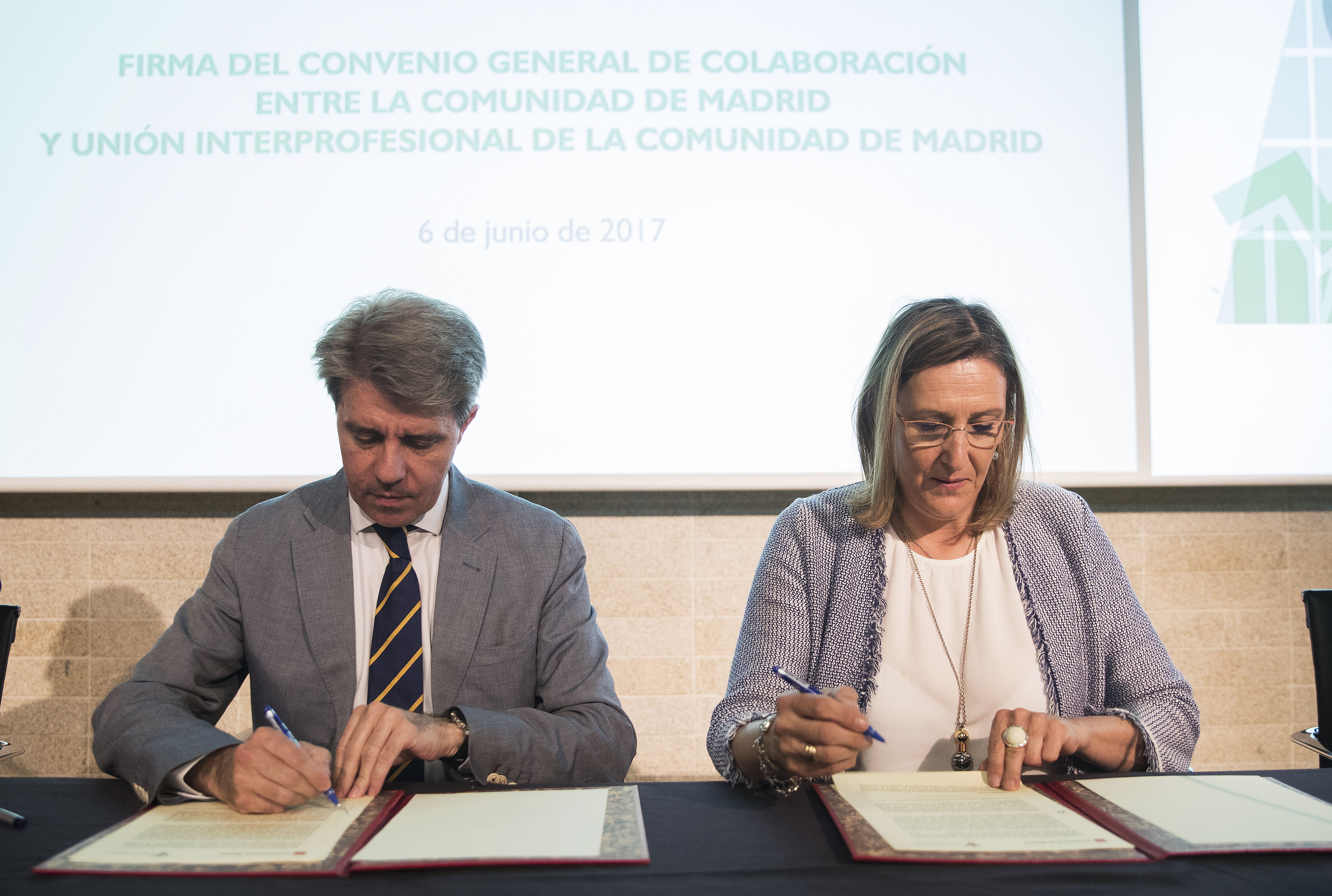 Como broche final de la primera edición del Día de las Profesiones, organizado por UICM y sus Colegios Profesionales del ámbito científico, docente, económico, jurídico, sanitario, social y técnico, la presidenta de UICM, Sonia Gumpert, y el consejero de Presidencia, Justicia y portavoz del Gobierno de la Comunidad de Madrid, Ángel Garrido, firmaron en la tarde de ayer la renovación del convenio de colaboración entre el Gobierno regional y Unión Interprofesional, vigente desde 2003, para seguir trabajando en pro de los colegios profesionales, la formación y su función social.