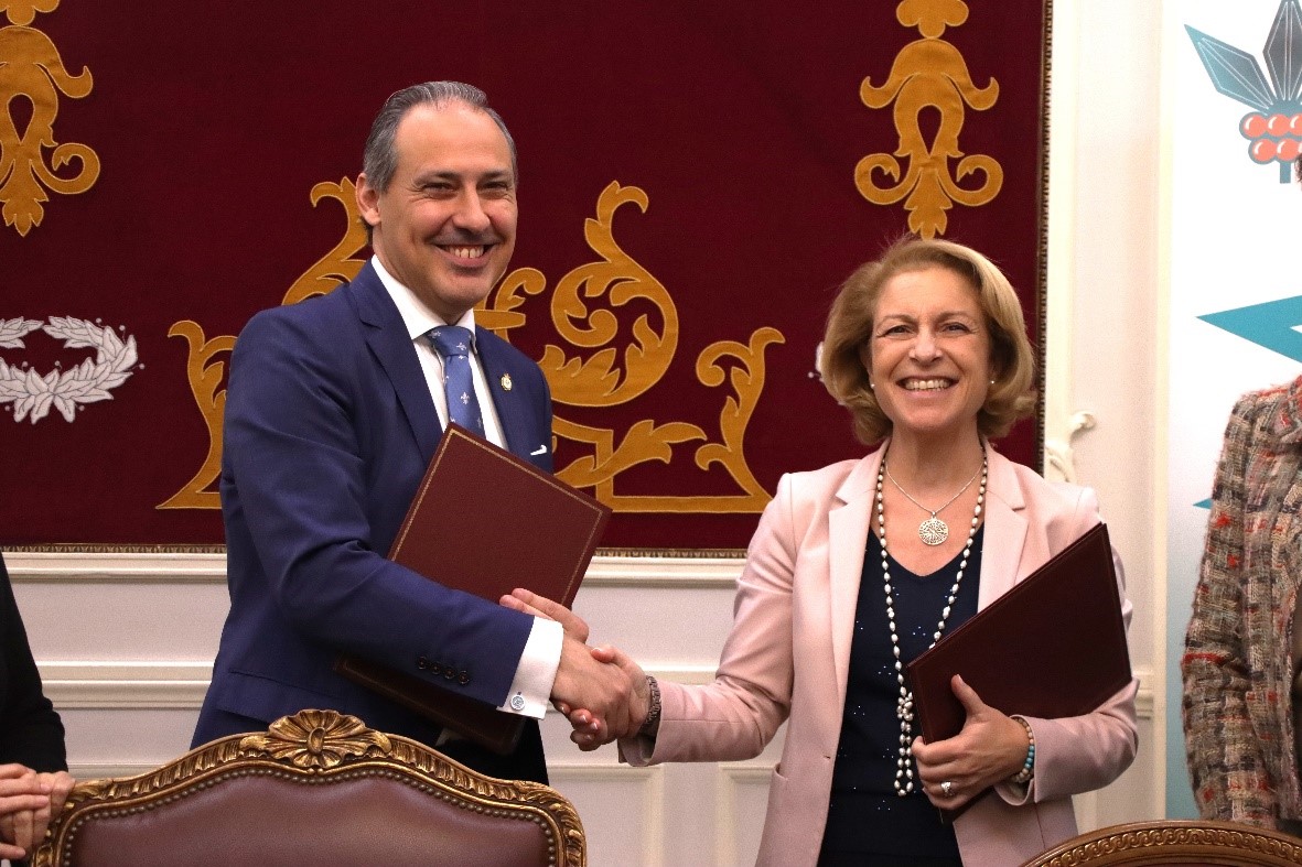 El presidente de UICM, Eugenio Ribón, y la rectora de la Universidad, Rosa Visiedo, tras la firma del acuerdo.