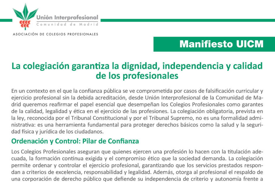 MANIFIESTO UICM: LA COLEGIACIÓN GARANTIZA LA DIGNIDAD, INDEPENDENCIA Y CALIDAD DE LOS PROFESIONALES